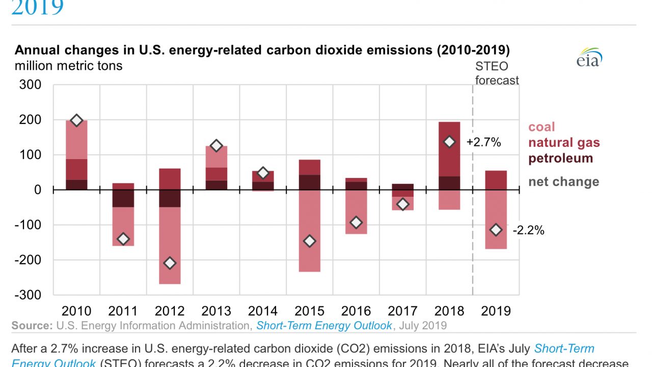 Here is the EIA: ”After a 2.7% increase in U.S. energy-related carbon dioxide (CO2) emissions in 2018, EIA’s July Short-Term Energy Outlook (STEO)