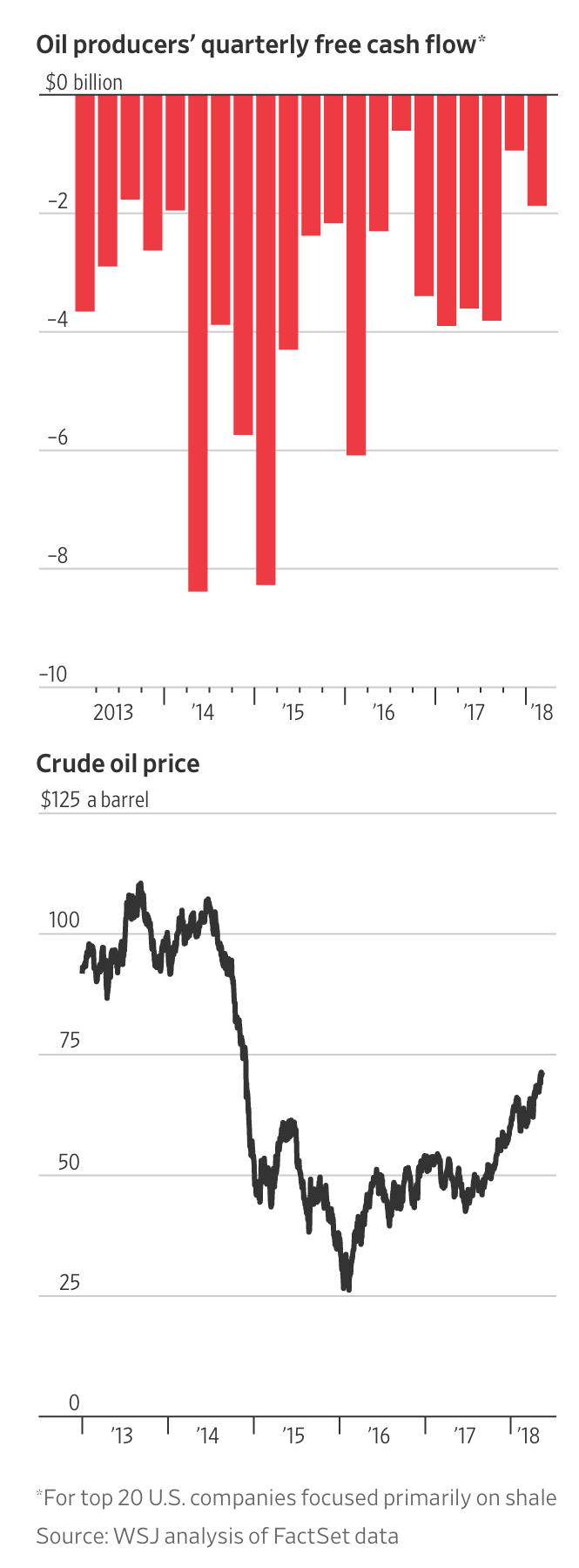 âHedging played a big role in companiesâ underwhelming cash generation. Seeking stability after years of wild fluctuations in crude prices, many operators entered into derivatives contracts in late 2017 that effectively ensured they could sell some of their 2018 output for $50 to $55 a barrel. Now that prices have risen to more than $70 a barrel, many are failing to capture the value of the rally. WPX Energy Inc.reported an adjusted net loss of $30 million last quarter, which it said was driven by $69 million in losses on its hedges due to higher oil prices.