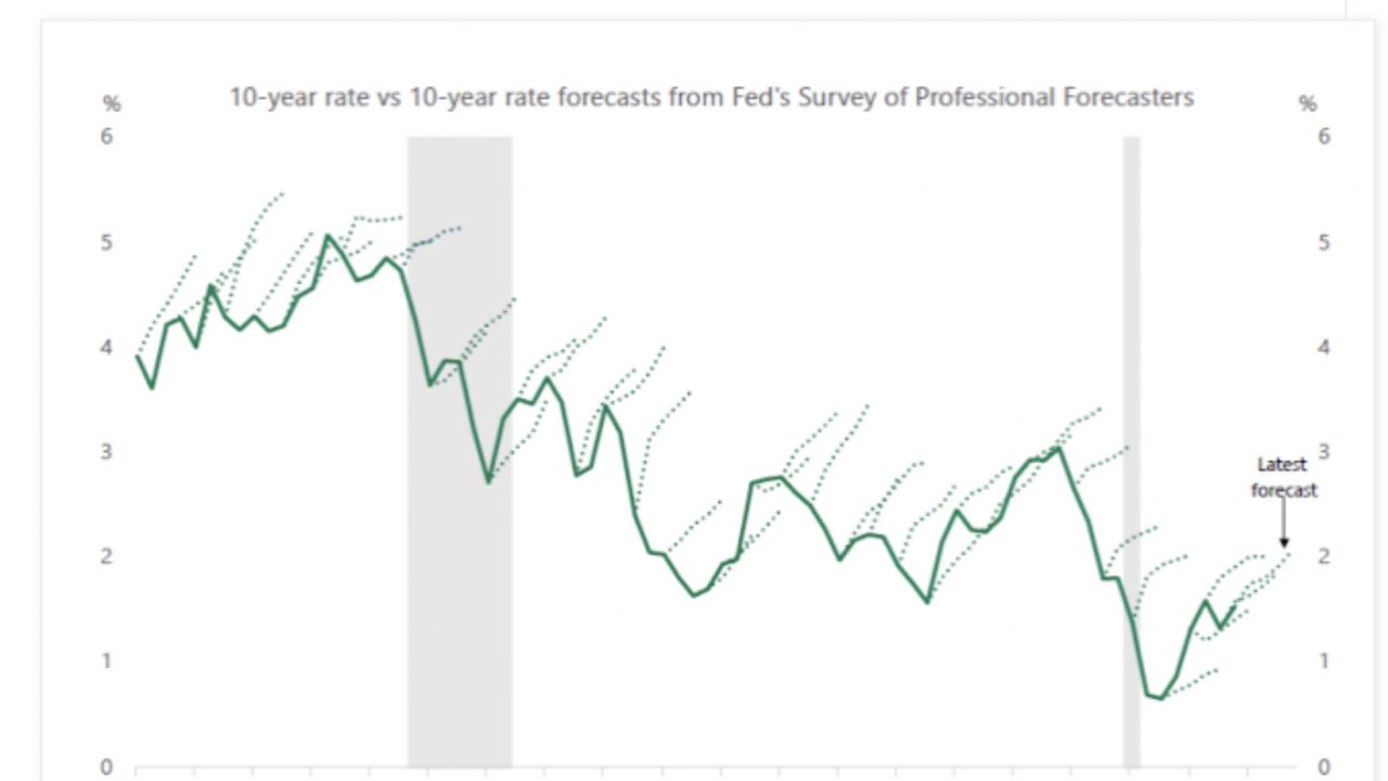 John H. Cochrane, The Grumpy Economist, quotes Torsten Slok (chief economist at Apollo Global Management) on forecasting interest rates, here: ”The