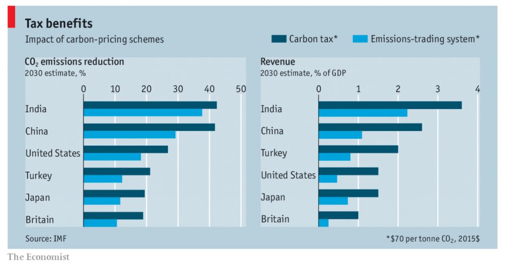 ”A new IMF working paper by Ian Parry, Victor Mylonas and Nate Vernon finds that taxes raise around twice as much revenue as today’s cap-and-trade schemes, and are roughly 50% better at cutting emissions (see chart). A levy of $70 on each tonne of CO2 by 2030 would typically raise between 1% and 2.5% of GDP in the G20 club of big economies. It would also allow most to come close to, or even exceed, their pledges under the Paris climate agreement of 2015, which aims to keep global temperatures no more than 1°C or so hotter than today. Researchers from the Potsdam Institute and the Mercator Institute find that if developing countries were to replace fuel subsidies with carbon taxes consistent with the Paris target, the windfall would cover much—95% in India’s case—of what they must spend on infrastructure and public services to meet the UN’s sustainable-development goals.”
