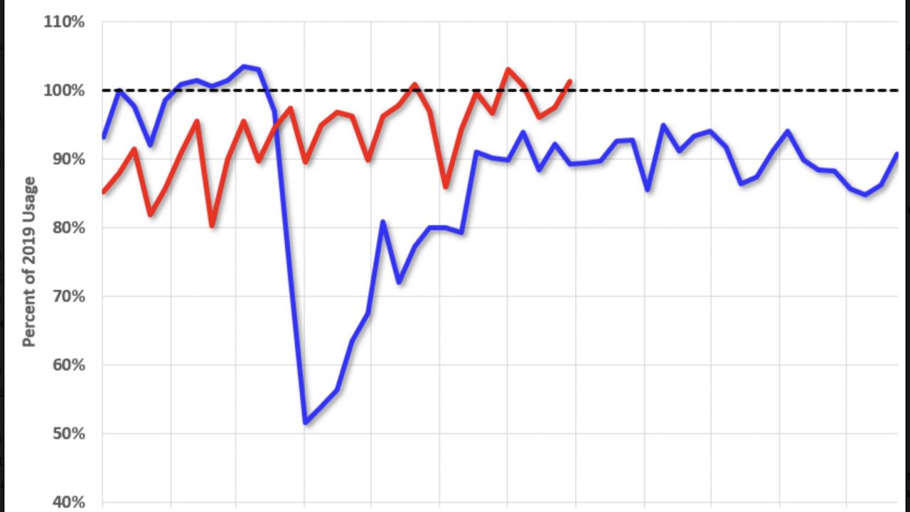Here are two economic indicators from Calculated Risk that indicate robust gasoline demand, not so for jet fuel, as compared to 2019…