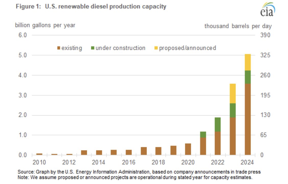 From the EIA’s This Week In Petroleum, here… ”Renewable diesel is often produced at a biorefinery or by co-processing at a petroleum refinery.