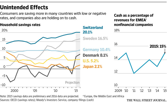 The Wall Street Journal suggests there are some unintended consequences of negative rates: "Policy makers in Europe and Japan have turned to negative