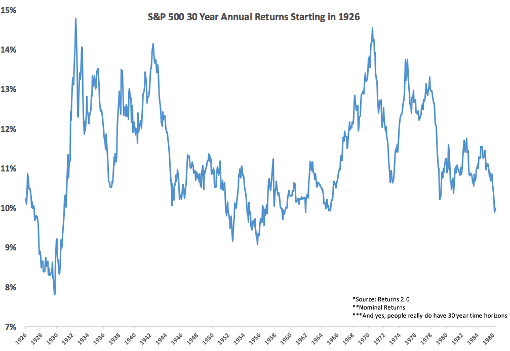 The blog "A Wealth of Common Sense" looks at rolling 30 year annual returns here: