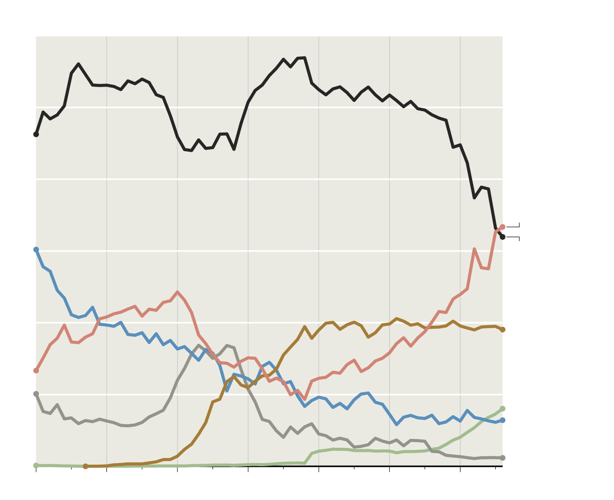 I pulled this chart from a NY Times article, which shows the rapidly declining share of the use of coal for producing electricity: Here is the
