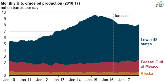 The EIA has a nice chart showing U.S. oil production on and offshore with projections: Here are their expectations: "In response to continued low