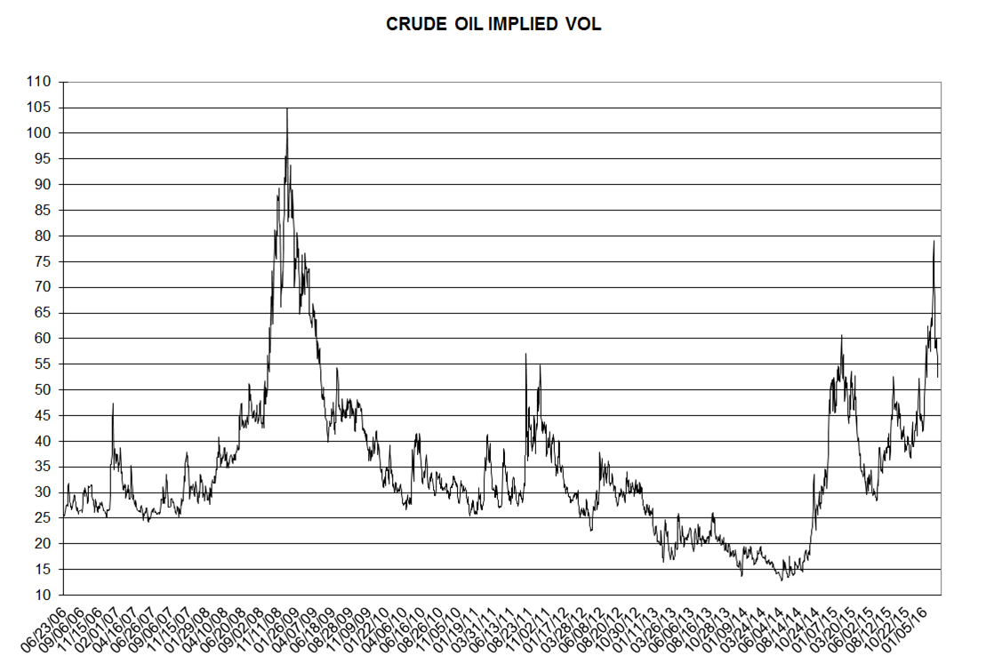 Here is a chart showing WTI implied volatility including yesterday's settlement: Option volatility has dropped sharply since it reached around 80%