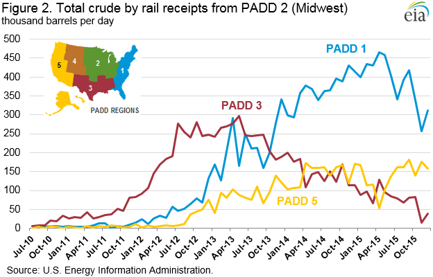 In the EIA's This Week in Petroleum: "Crude supplies carried by rail from the Midwest to the East Coast (PADD 2 to PADD 1) continue to be the largest