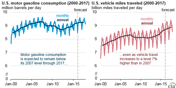 The EIA expects gasoline demand to remain below its 2007 peak despite an increase in miles driven... "Based on estimates in the most recent