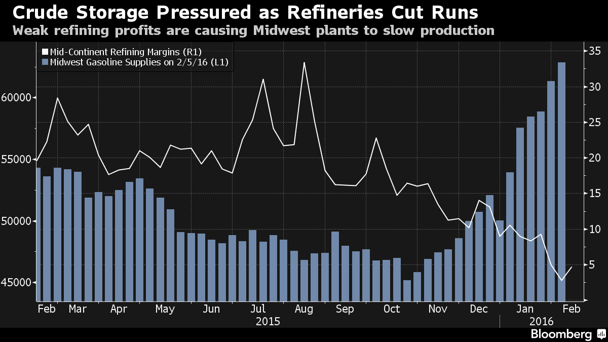 From Bloomberg: (http://www.bloomberg.com/news/articles/2016-02-11/oil-hits-latest-hurdle-as-u-s-fuel-glut-puts-brakes-on-refining) Here is the