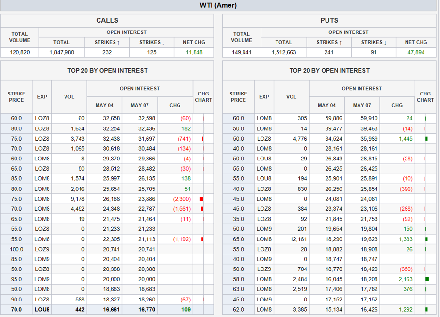 Going into today's trading day and ahead of the President's expected 2 p.m. announcement on the JCPOA, here is a snapshot of options activity in WTI