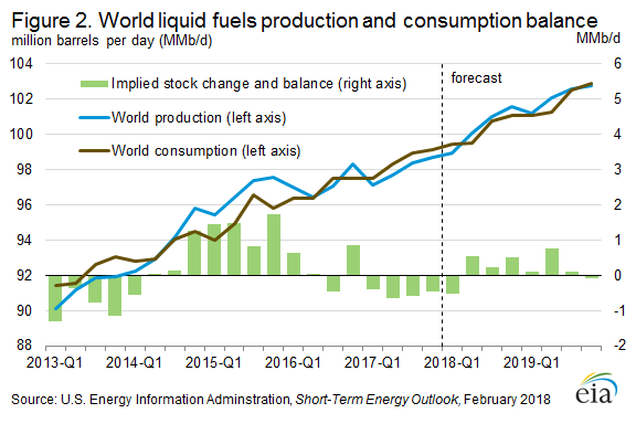 Despite the recent increase in estimates of US oil production, the EIA is only looking for a build in world inventories of .2 mbd for 2018 and