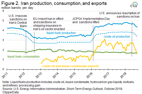 From “This Week In Petroleum”, the EIA discusses assumptions on Iranian production, here: “The October STEO assumes that the effects of sanctions