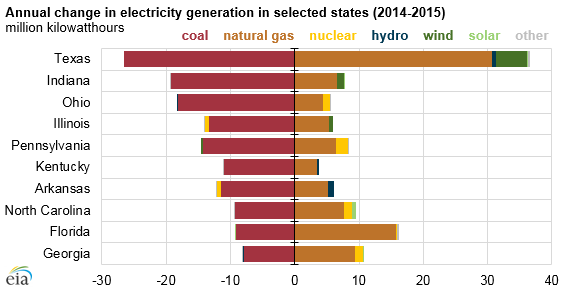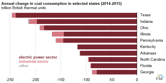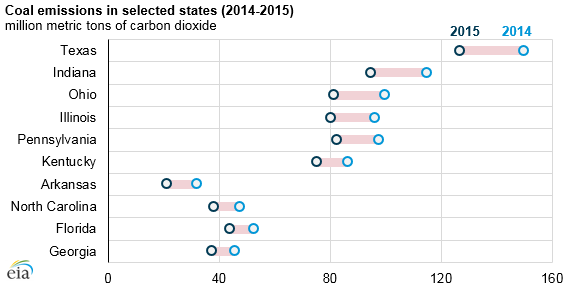 ”Carbon dioxide (CO2) emissions associated with coal consumption in the United States fell by a record 231 million metric tons in 2015. More than 60% of the annual decrease occurred in 10 states, led by Texas, Indiana, Ohio, Illinois, and Pennsylvania, according to EIA’s state-level carbon dioxide emissions data. Most of the decline in 2015 U.S. coal consumption occurred in the electric power sector, where reduced coal-fired electricity generation was largely offset by higher natural gas-fired electricity generation.”