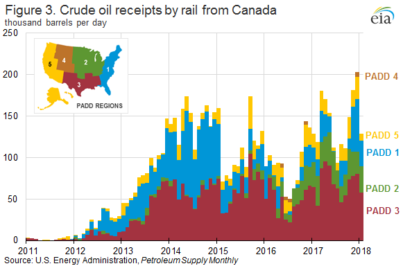 Because of these conditions, volumes of Canadian crude oil exported to the United States by rail increased between 2016 and 2017. In December 2017, U.S. imports of Canadian crude oil by rail set a monthly record of 203,000 b/d, nearly matching domestic intra-U.S. crude oil by rail movements of 240,000 b/d for the same month (Figure 1). While U.S. crude oil by rail imports from Canada fell to 129,000 b/d in January 2018, volumes remain slightly higher year-over-year.”