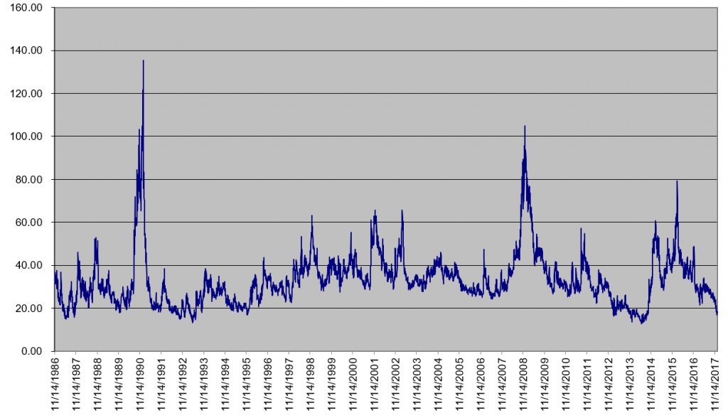 Here is a chart showing crude oil implied volatility since options began trading on the exchange in 1986… The data are based on the at the money, second nearby option (which now is March):