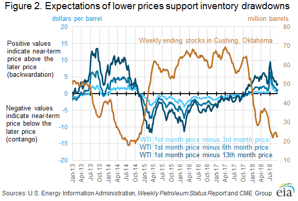 ”Crude oil inventories held at Cushing, Oklahoma, decreased by more than half since this time last year, recently falling to lows last reached in 2014. Logistical factors and strong demand for crude oil from both domestic refining and exports markets have contributed to the steep year-over-year decrease.”