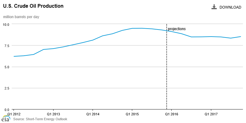 While the annual projections of crude production by the EIA in the Short Term Energy Outlook often garner all the headline news its often instructive to delve into the numbers ,particularly on a monthly and quarterly basis. In its latest report the EIA projected a 2016 tough in crude production of 8.33 mbd in September or 0.147 mbd from Decembers projected 2016 trough of 8.47 mbd. Significantly this would represent a decline of 1.4 mbd from the April 2014 peak of 9.7 mbd and a reduction of 0.9 mbd from the current level of US production.Looking at the fourth quarter 2016 projected production, the EIA revised DOWN their estimate from Decembers STEO’s number of 8.74 mbd to the new January estimate of 8.49. Furthermore the EIA is looking for the first quarter of 2017 to maintain lower production at 8.5 mbd . The 2017 trough incidentally is projected to be 8.25 mbd also in September. The market of course has been sorely disappointed that US production has not declined more rapidly, but the declines appear as if they will intensify as we move through the second into the third quarter 2016, when US production declines from 8.86 mbd in the second quarter to 8.48 mbd in the third . Expectations of declining US production had been a bullish theme throughout last year. This year the scenario will play out and the EIA is indicating the surprises could be to the downside on output.