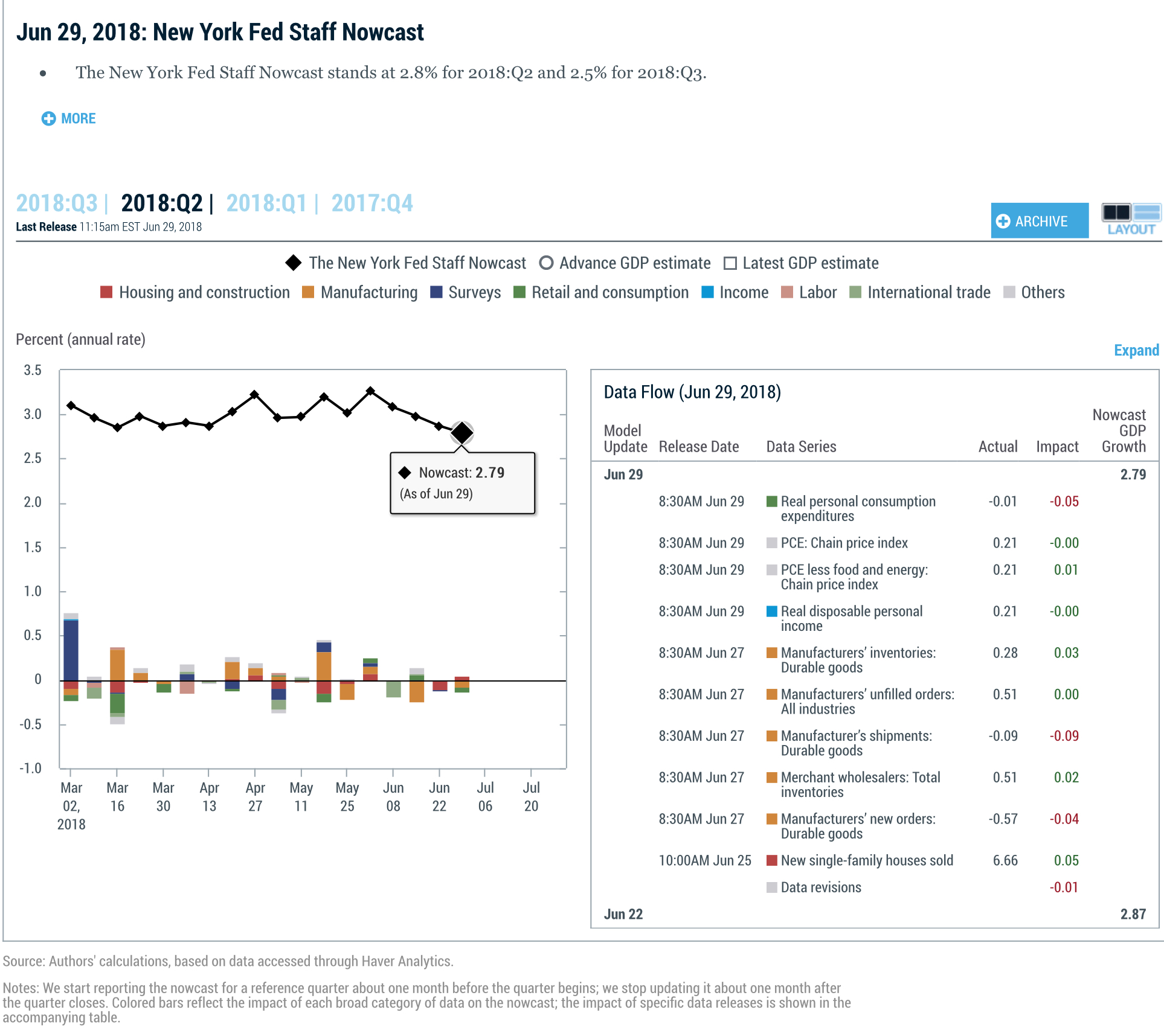 “The GDPNow model estimate for real GDP growth (seasonally adjusted annual rate) in the second quarter of 2018 is 3.8 percent on June 29, down from 4.5 percent on June 27. The nowcast of second-quarter real personal consumption expenditures growth declined from 3.7 percent to 2.7 percent after this morning’s personal income and outlays report from the U.S. Bureau of Economic Analysis.”