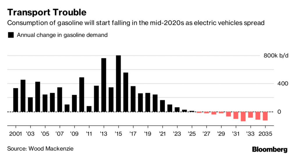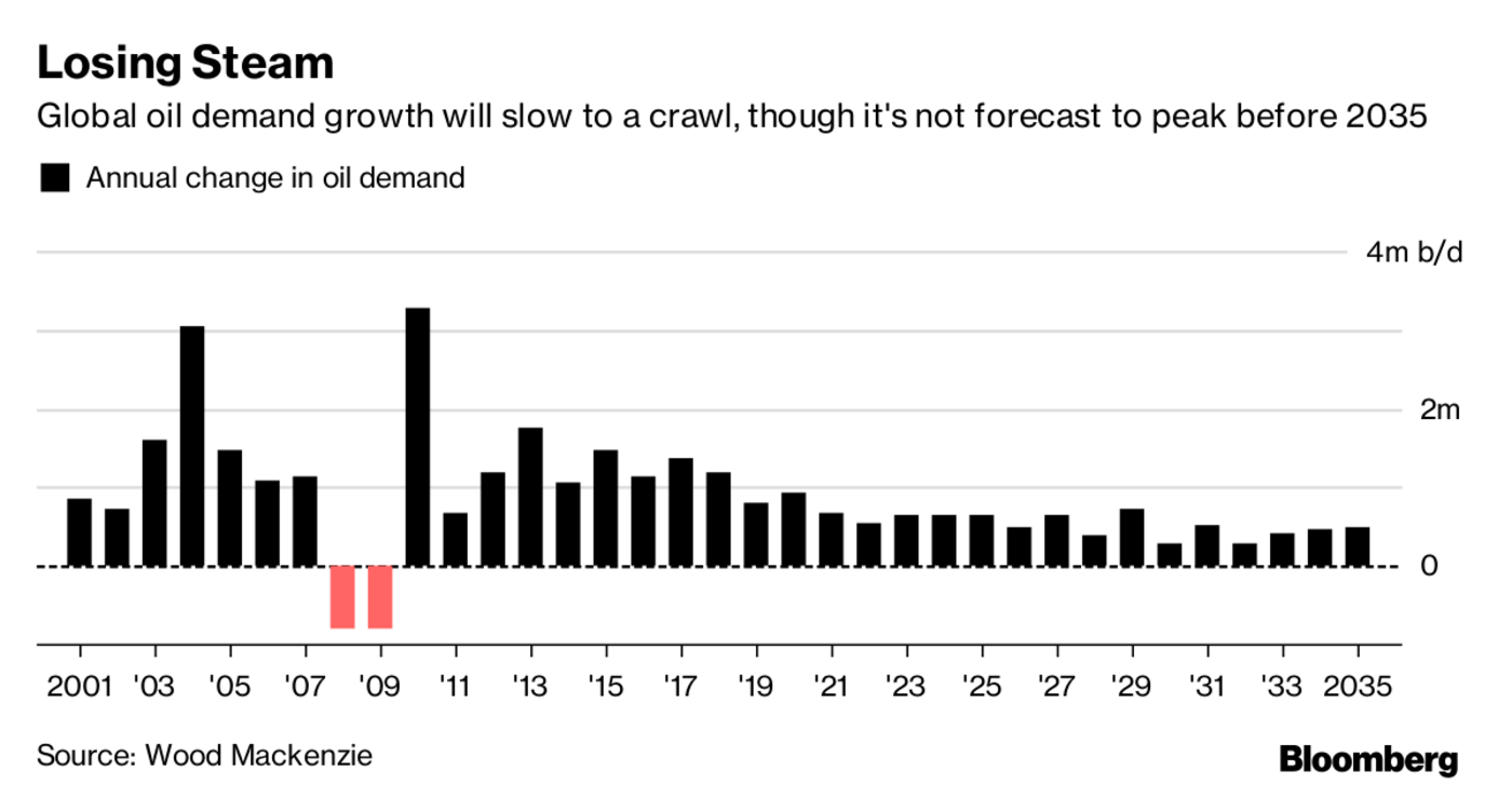 “Global oil demand growth will slow to a crawl and gasoline use will peak within the next decade, prompting the world’s biggest energy companies to accelerate the shift to natural gas and chemicals, according to consultant Wood Mackenzie Ltd.”