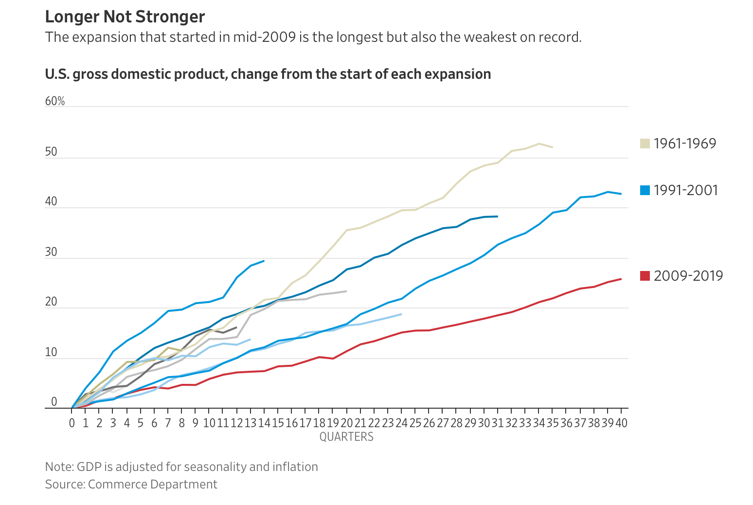 ”The expansion that started in mid-2009 is officially tied for the longest on record. It’s also the weakest. The economy grew about twice as much during the shorter-lived 1961-1969 expansion, one of the most robust periods of growth at least since World War II. On the bright side, this one shows no signs of quitting. The 1991-2001 stretch petered out after 40 quarters. The current expansion appears to be cruising easily into its 41st.”