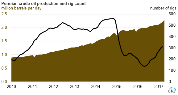 “With the rise in oil prices from their low point in early 2016, EIA’s April Short-Term Energy Outlook (STEO) expects crude oil production growth in the Permian to accelerate. EIA’s April Drilling Productivity Report (DPR) indicates a total of 310 oil-directed rigs active in the Permian, 158 more than at the same time last year. The DPR also estimates crude oil production in the Permian at 2.3 million b/d as of April 2017, or almost 300,000 b/d higher than the same month in 2016.”