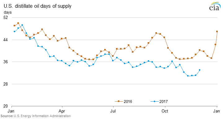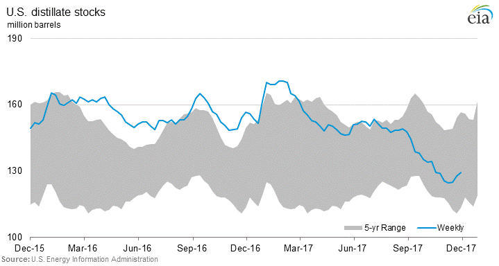 Distillate stocks are still closer to the low end of the five year range…