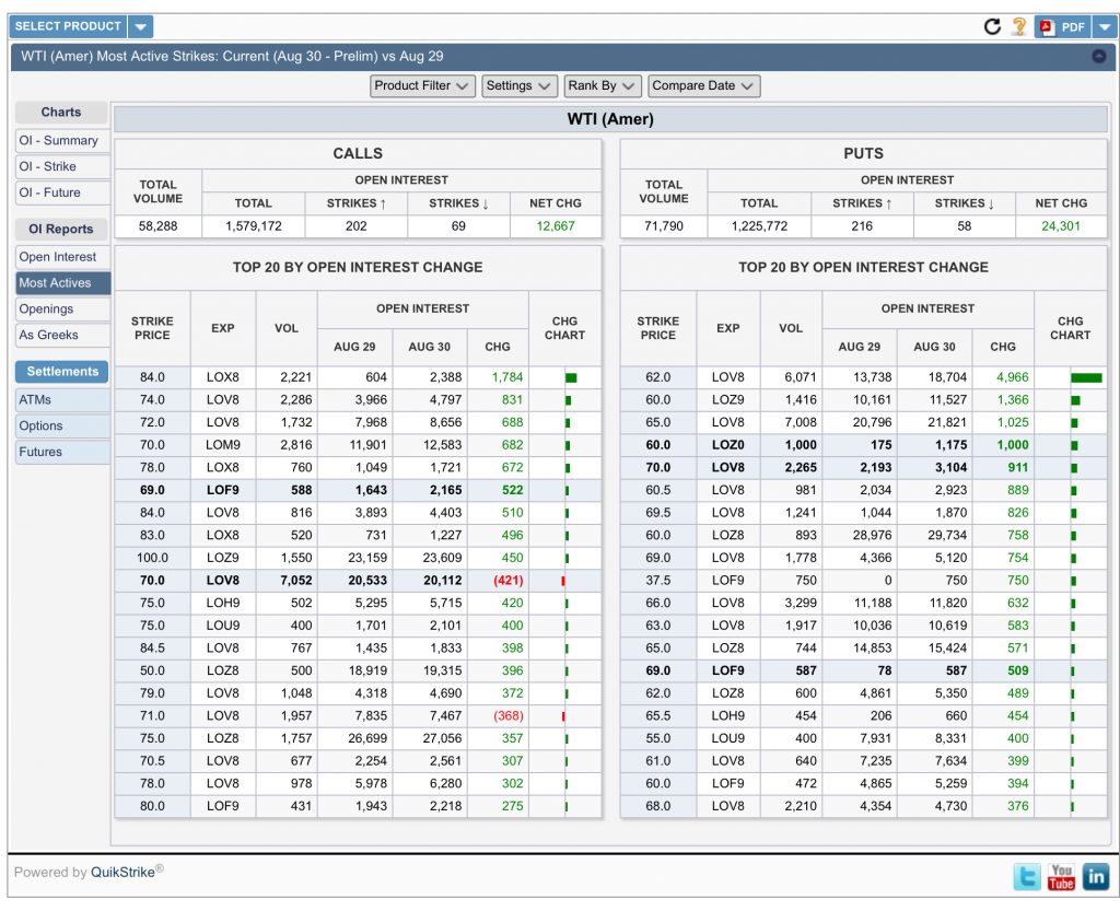 Here is the CME’s snapshot of options trades ranked by change of open interest: