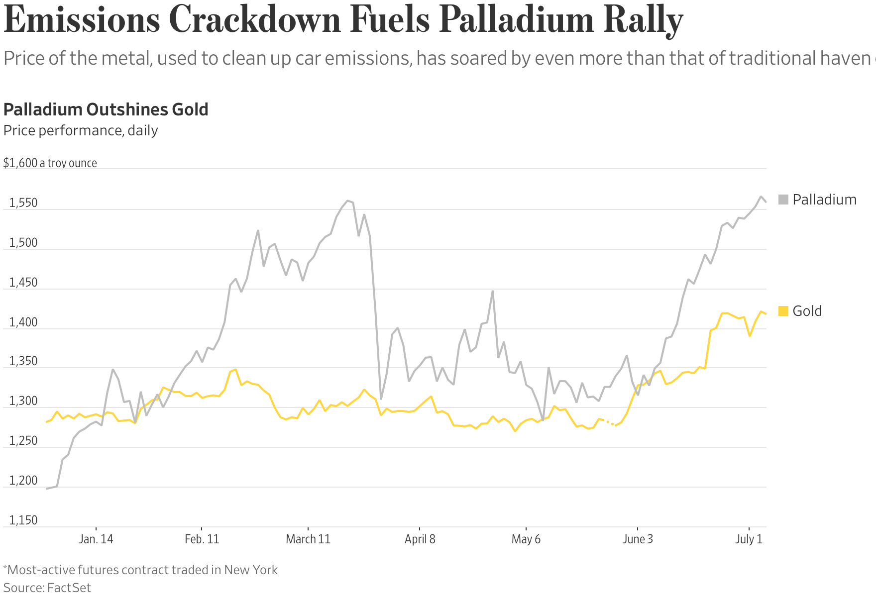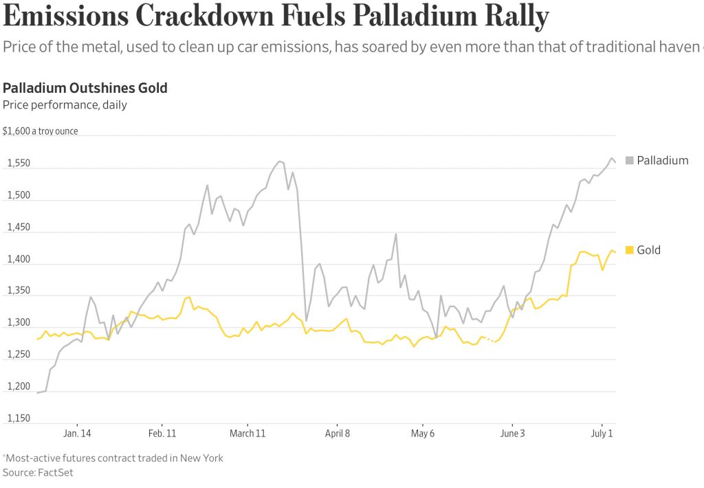 “A key ingredient in the catalytic converters that reduce pollutants in car fumes, palladium in January became the most expensive precious metal for the first time since 2002. After a 16% surge over the past month, it now fetches $1,555.20 a troy ounce, a premium of almost $140 an ounce over gold.”