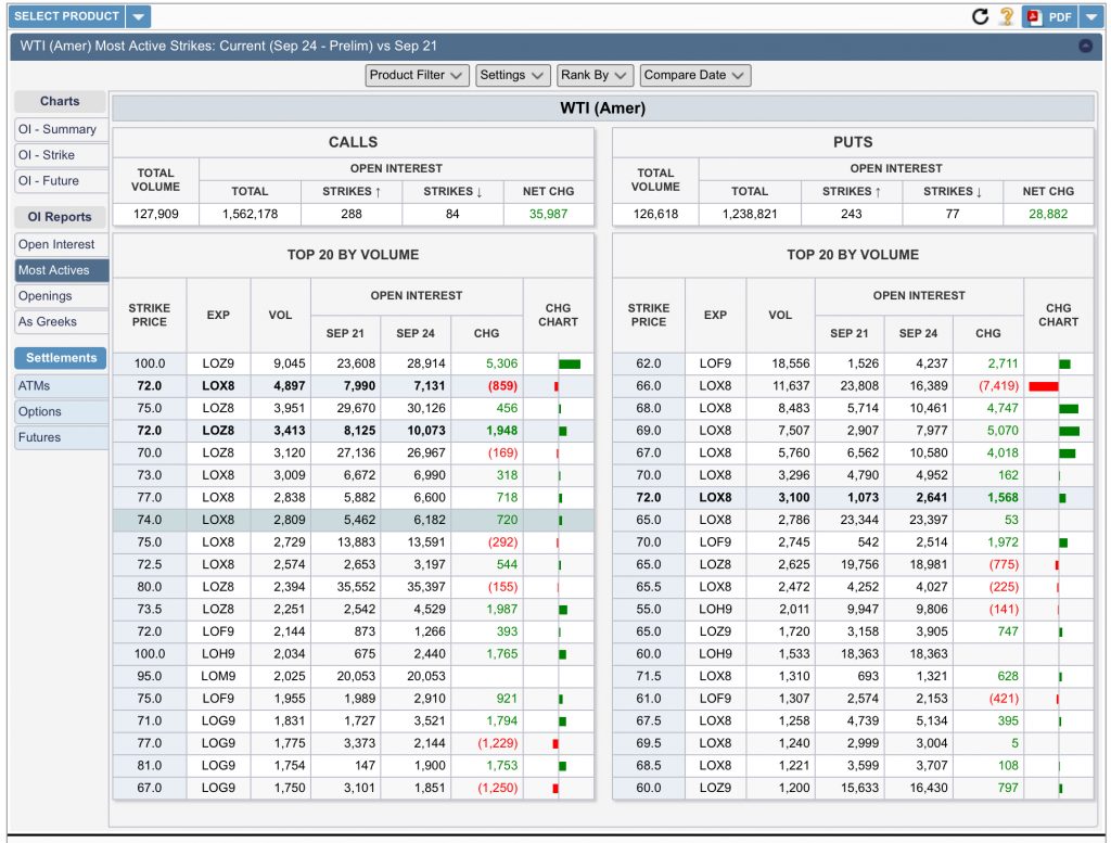 From the CME’s options tool, here is a snapshot of WTI options activity from yesterday (not a record volume day):