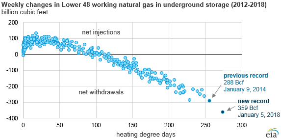 “During the recent cold weather event that affected much of the eastern United States, more natural gas was withdrawn from storage fields around the country than at any other point in history. Net withdrawals from natural gas storage totaled 359 billion cubic feet (Bcf) for the week ending January 5, 2018, exceeding the previous record of 288 Bcf set four years ago.”