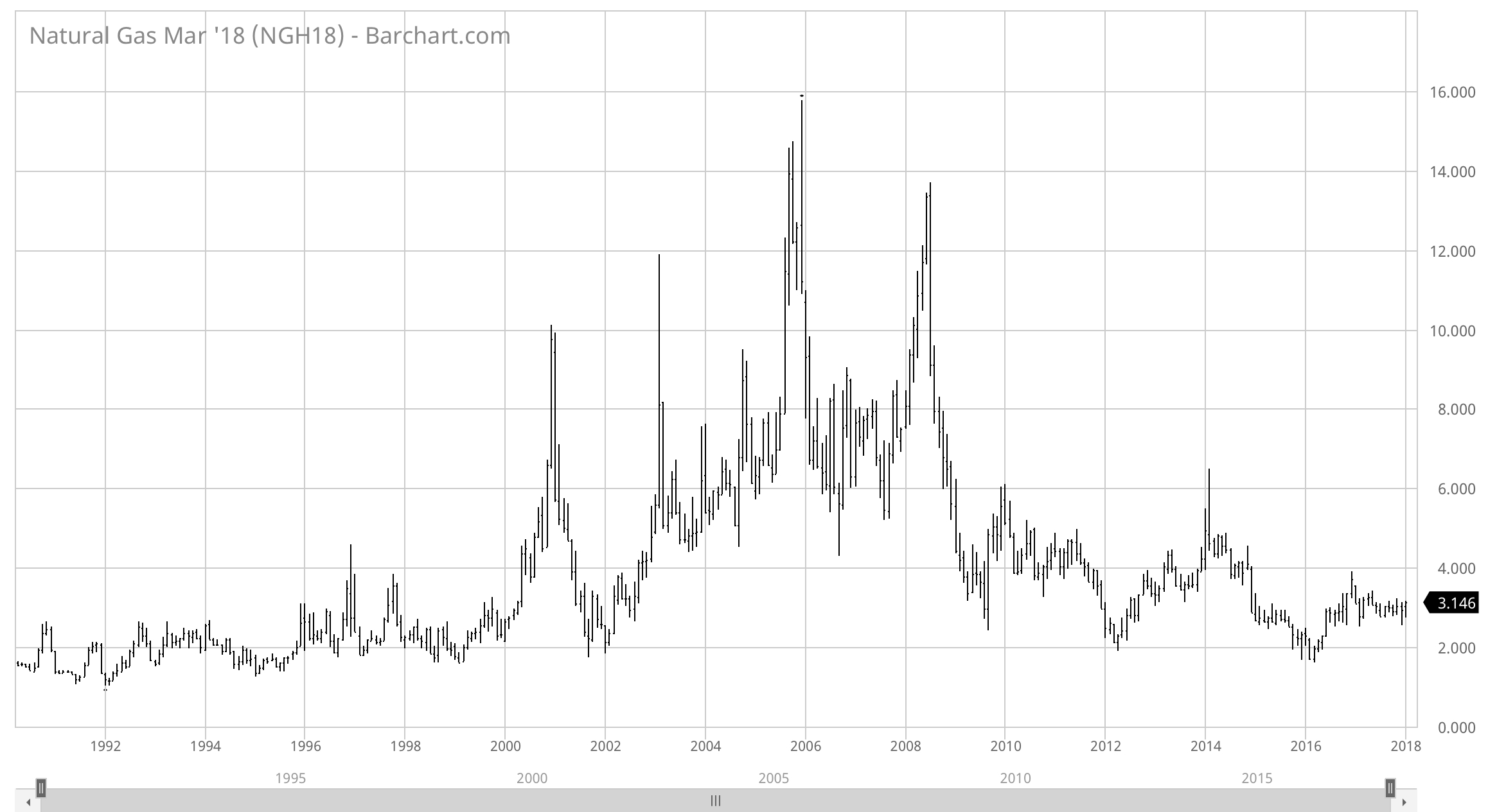 And here is a long term chart of natural gas futures prices, from Barchart, which are based on the Henry Hub In Louisiana: