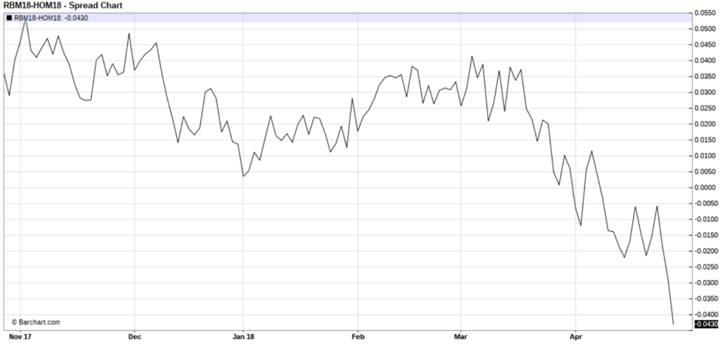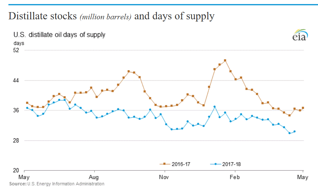 I like to check in on the “days supply” for distillates and gasoline updated weekly in This Week In Petroleum by the EIA, here… Gasoline looks similar to last year, distillates look a bit tighter… Note the bottom chart (from Barchart.com) which shows the Rbob/diesel futures spread (which is my colleague Andy Lebow’s “widowmaker” trade… every market has a widow or widower maker, think March/April natural gas, short vix, etc..), pretty much showing what we see in the days supply pictures…