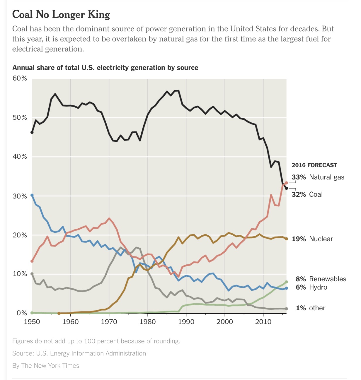 I pulled this chart from a NY Times article, which shows the rapidly declining share of the use of coal for producing electricity:
