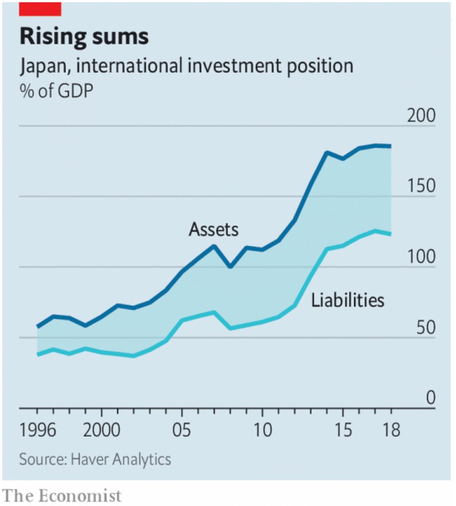 “Japan is already the world’s biggest creditor. Its net foreign assets—what its residents (government, householders and firms) own minus what they owe to foreigners—are worth around $3trn, or 60% of its annual gdp. And that understates Japan’s influence on global asset markets. Since 2012 both sides of its national balance-sheet have grown rapidly (see chart), as Japanese investors borrowed abroad to buy yet more assets.”