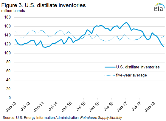 ”Despite record refinery runs and lower exports, distillate inventories in the United States have declined because consumption has outpaced the rate at which inventories have been replenished.”