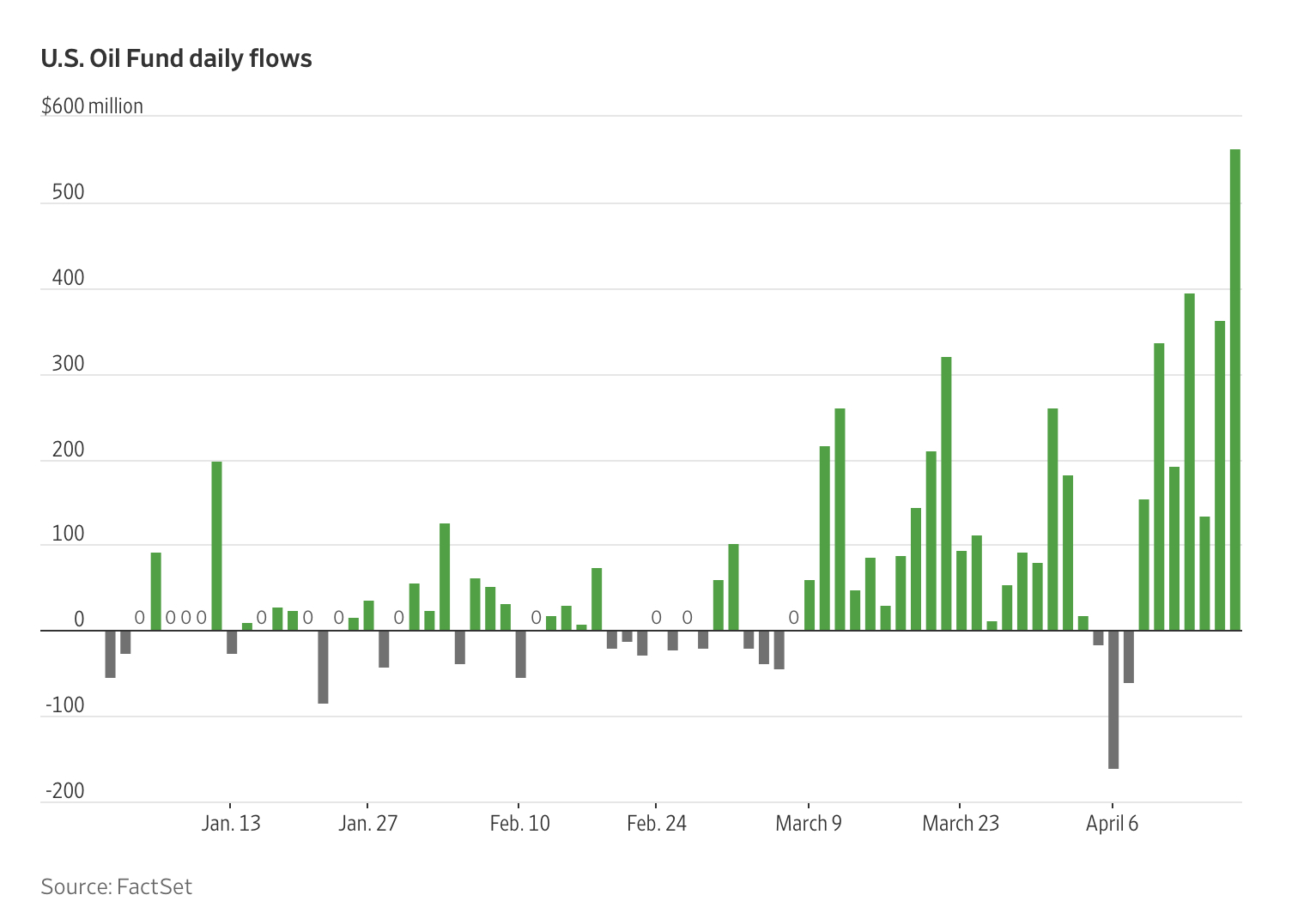 ”Roughly $5 billion has flowed into the U.S. Oil Fund this year, with much coming in the past few weeks. It fell 15% to $3.18 on Tuesday. As of Friday, the fund held about 27% of the outstanding contracts for June U.S. crude futures. USCF said late last week it is shifting the fund’s structure to hold about 80% of assets in near-dated contracts and roughly 20% in second-month contracts.”